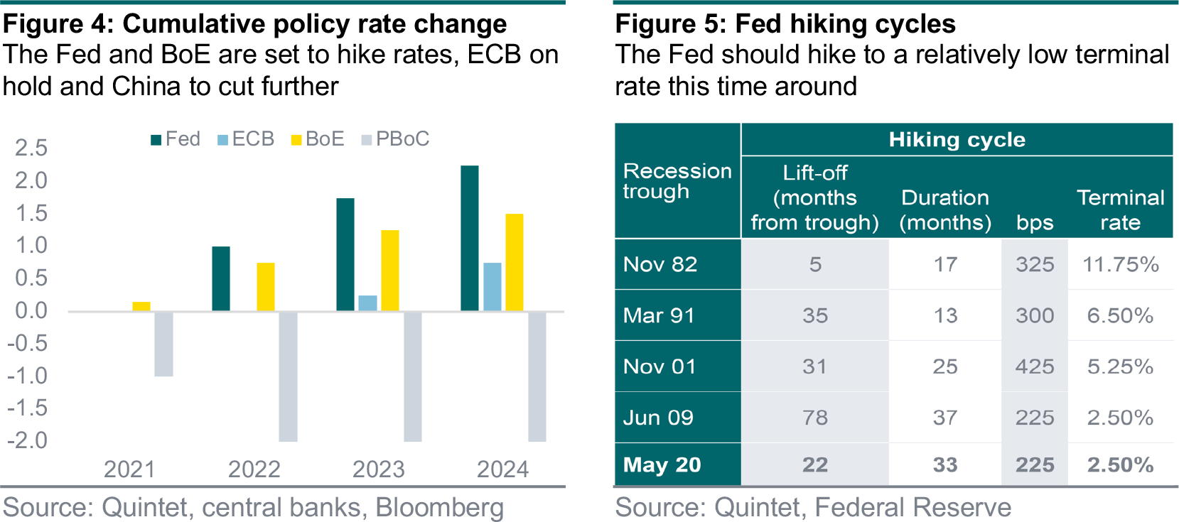 Central bankers are likely to be busy in 2022 (figures 4 and 5). The Fed (from April) and the Bank of England (starting this month) should stop their net asset purchases and hike rates from record lows. This year, the Fed is likely to hike three or four times for a total of 75 to 100 bps, and to keep hiking at a similar pace next year. The Bank of England, which already hiked in December 2021, is likely to hike two or three times in 2022 for a total of 50 to 75 bps, and then continue hiking in 2023. It will likely take 18 months for the US and about 6 months for the UK to raise the key policy rate to pre-Covid levels – which were still low. Both central banks are also likely to start shrinking their balance sheets. The ECB is unlikely to stop its net asset purchases or hike in 2022. The People’s Bank of China is cutting rates and easing financing conditions.