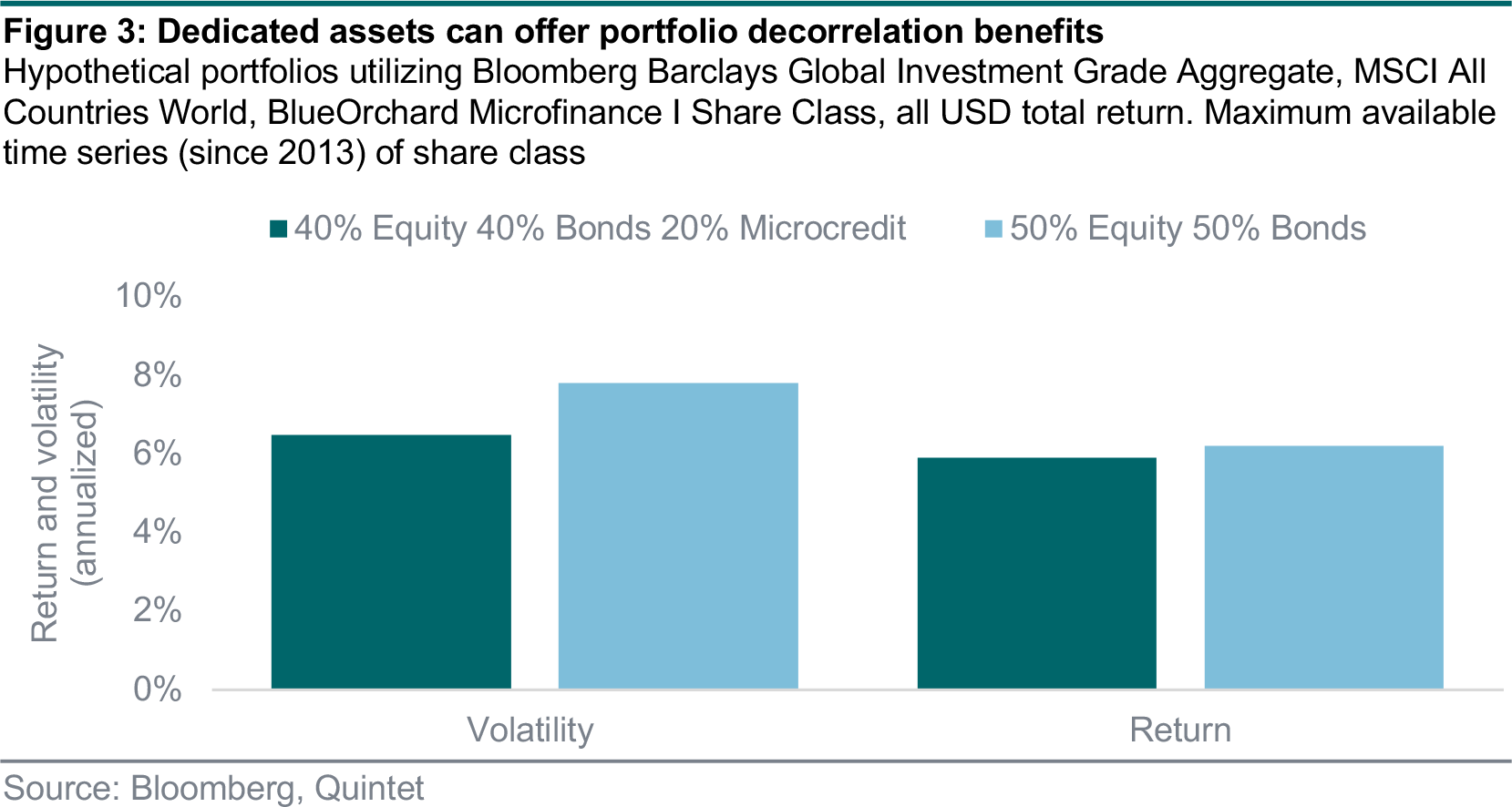 Dedicated assets that deliver an exposure not found in other financial instruments can offer significant portfolio decorrelation benefits. Figure 3 shows the change in historic risk-adjusted return for a simple equity–bond portfolio with the addition of microcredit.