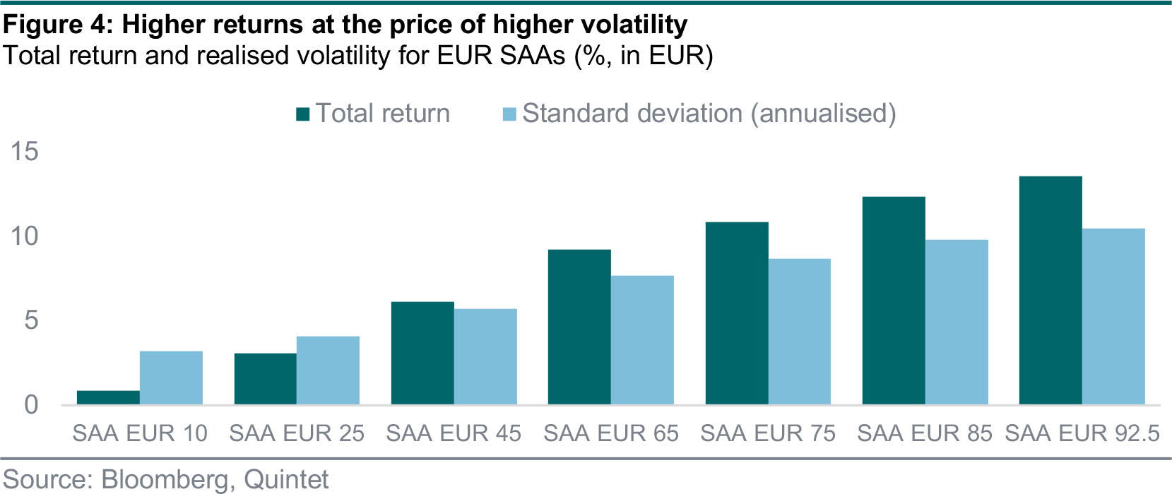 Last year, we launched our new Quintet strategic asset allocations (SAA) to help our clients stay invested through good times and bad and reap the benefits form compounding returns over time. These SAAs define a set of long-term asset allocations to match different appetites for risk and return expectations and generate the most efficient portfolios from a risk-adjusted perspective.